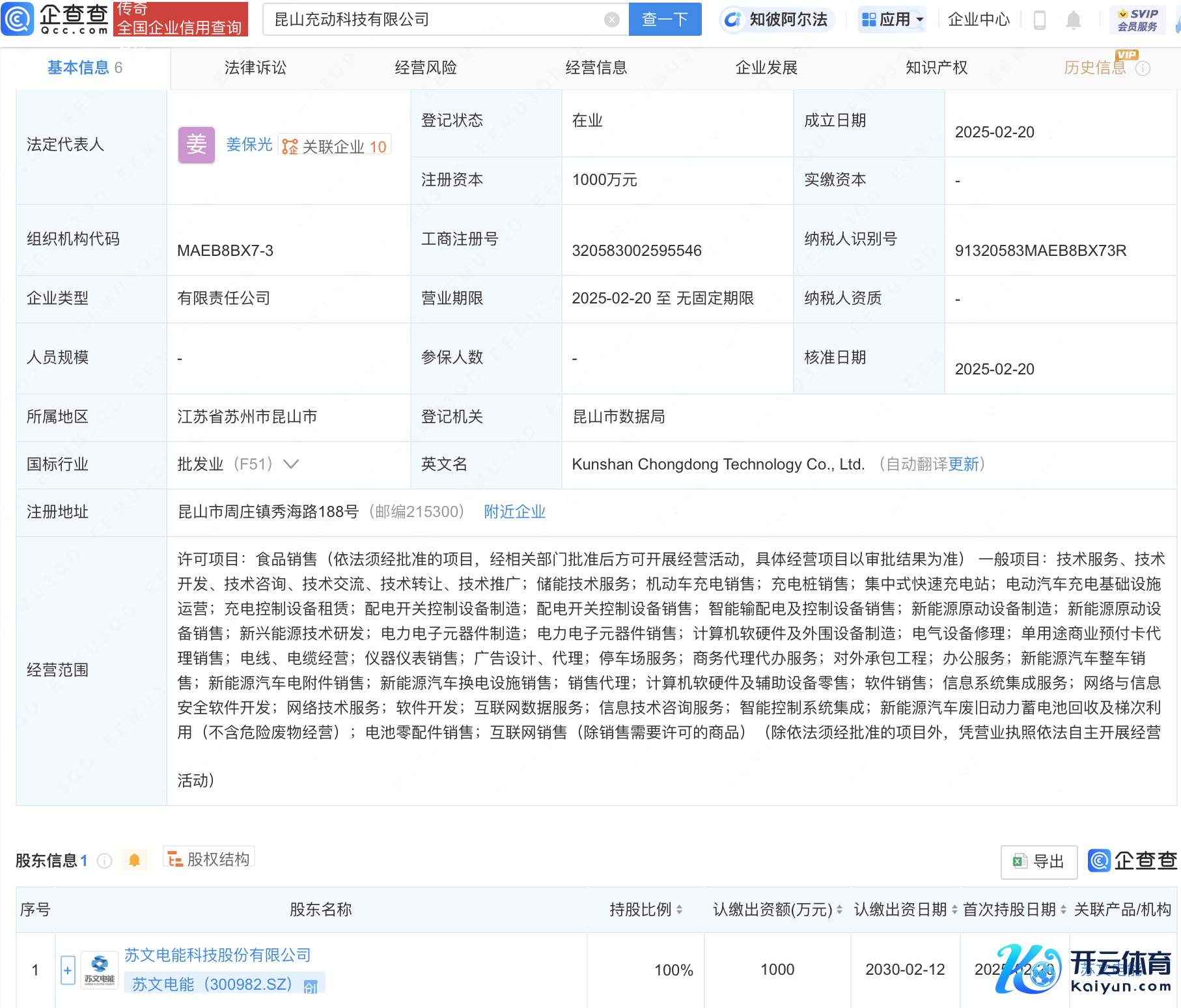 企查查APP流露,近日,昆山充动科技有限公司缔造开云体育,法定代表东谈主为姜保光,注册成本1000万元,标的鸿沟包含:新动力汽车电附件销售;新动力汽车换电程序销售;软件开拓;互联网数据处事等。企查查股权穿流露出,该公司由苏文电能(300982)全资捏股。